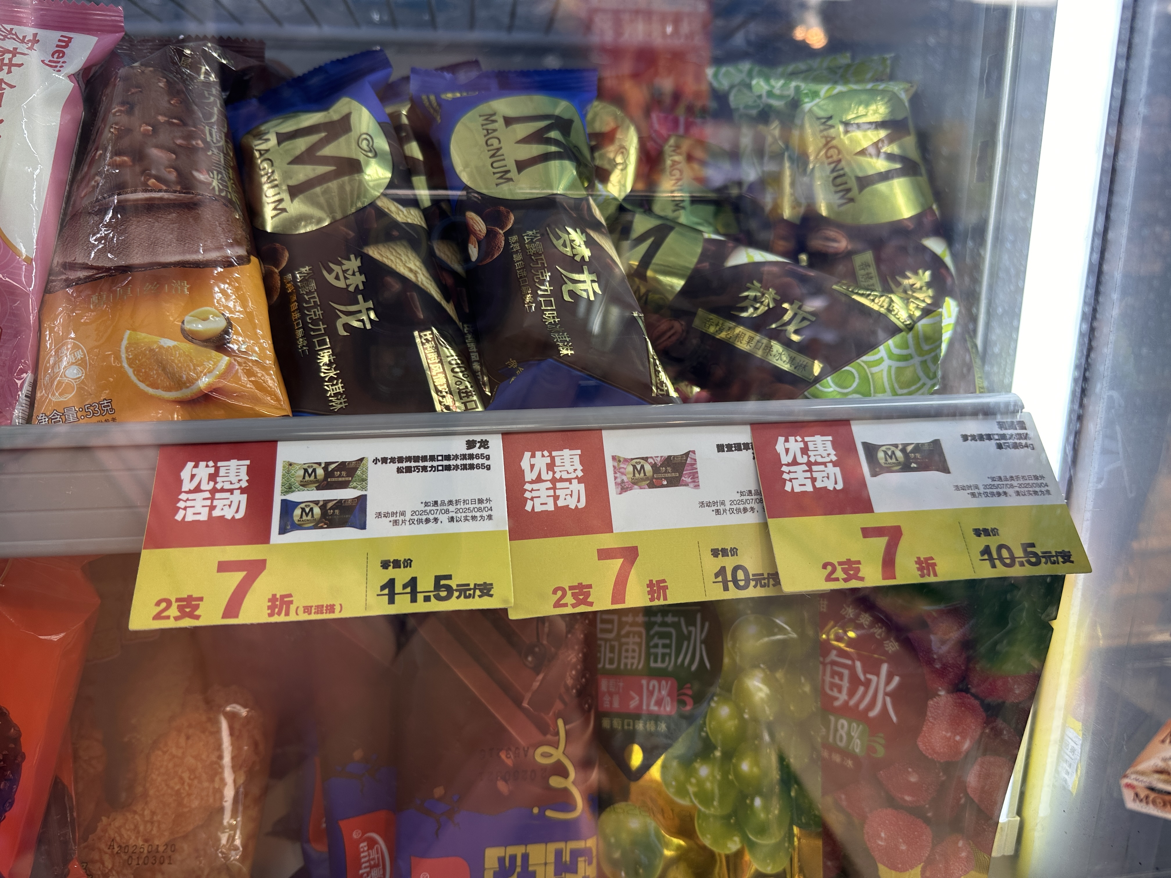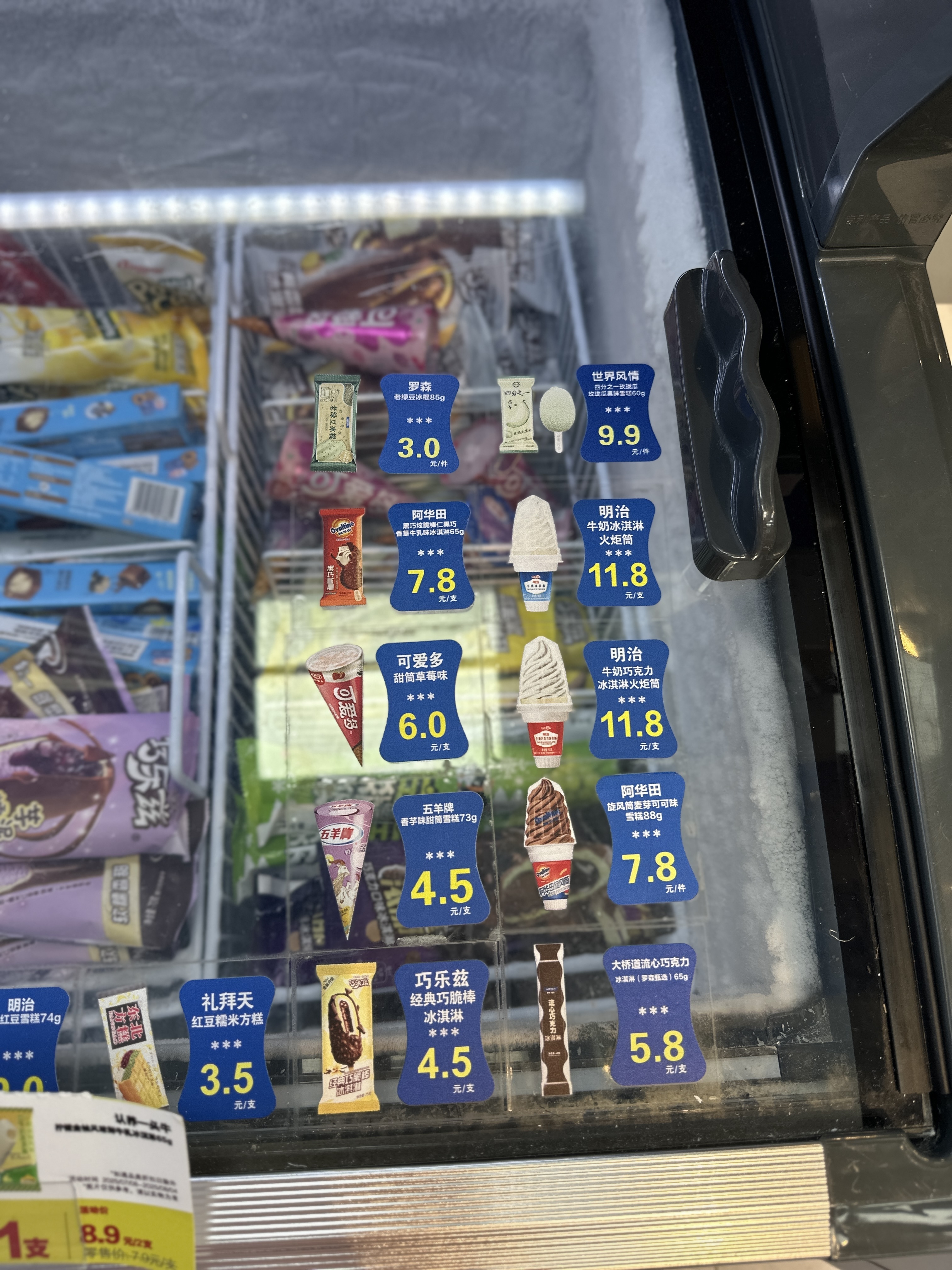 如今,钟薛高的身影已经完全消失。冰柜里产品的主要价位在3到10元区间。其中,不少品牌打出了优惠宣传“认养一头牛8.9元两支”“甄稀11元两杯”“梦龙2支7折”……